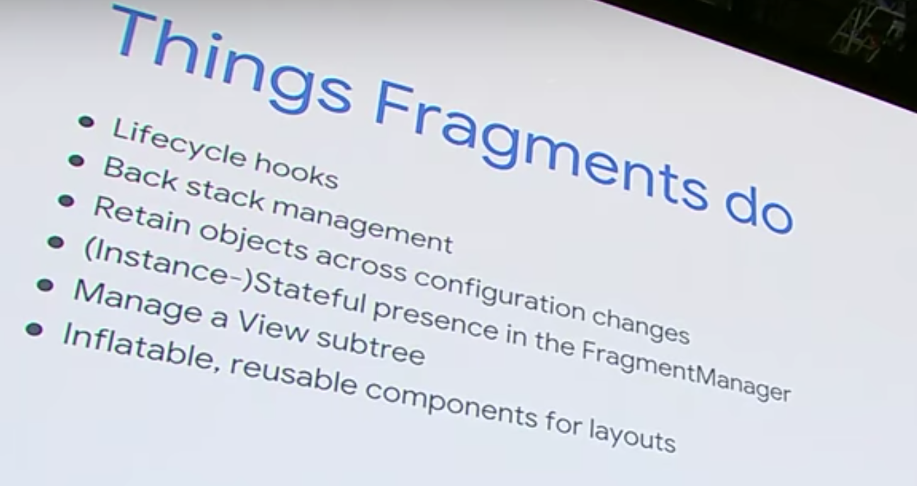 So Fragments were really designed to make sure that you could do one thing, and that was to allow splitting up these huge activity classes. This was something that, again, we were seeing the pain that developers were feeling that their activity classes were getting really big and hard to manage. So we wanted to see, could we allow for you to decouple some of the various things that your activity classes are doing to sort of relieve a little bit of that pressure? So that means that anything a Fragment can do-- or anything an Activity can do, a Fragment had to be able to do, too. And that guided a whole lot of the API design from the beginning.